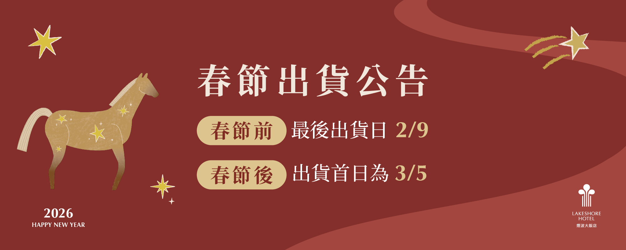 春節出貨公告 :【春節前】最後出貨日 2/9,【春節後】出貨首日為 3/5。
