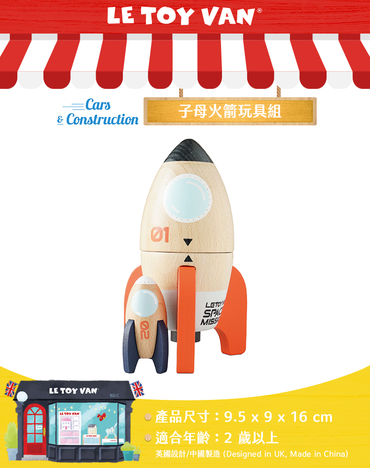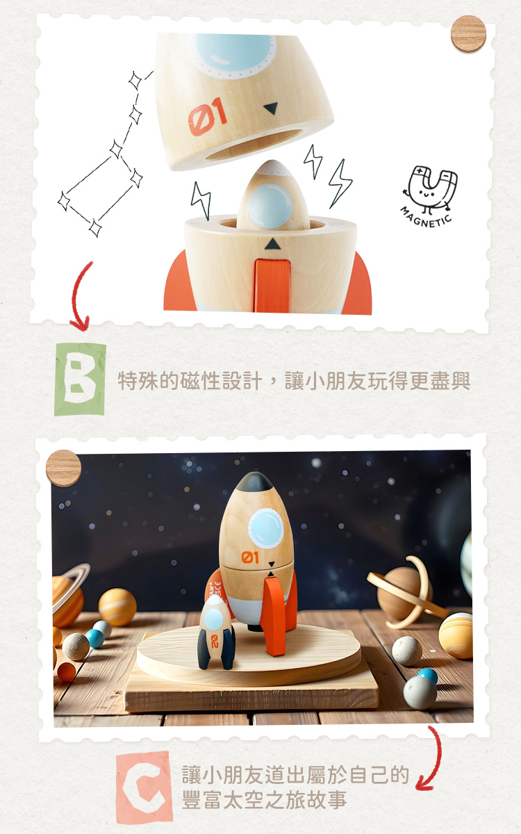 。子母設計,在大火箭裡藏著一個蓄勢待發的小火箭,特殊的磁性設計,讓小朋友玩得更盡興