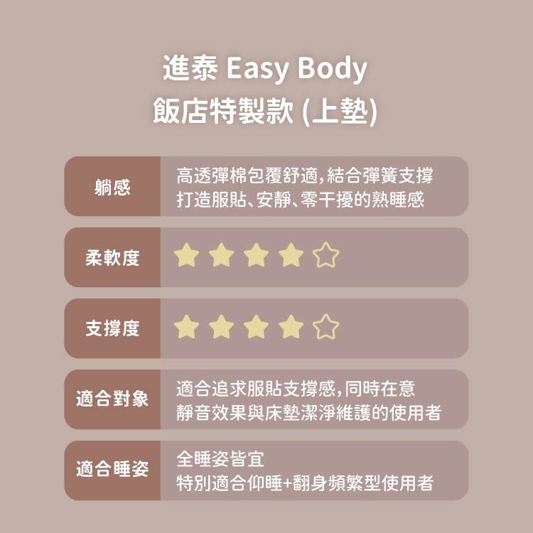 (可單獨選購上墊,也可搭配 進泰Easy Body 飯店特製款-下墊 使用,下墊可增加床墊舒適性及使用年限)
