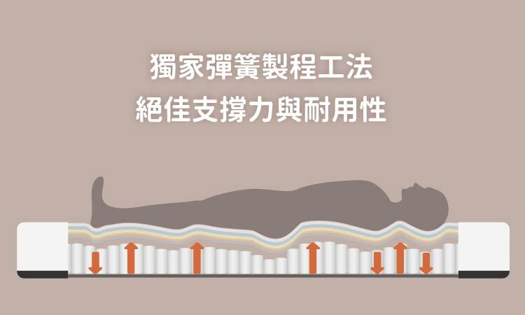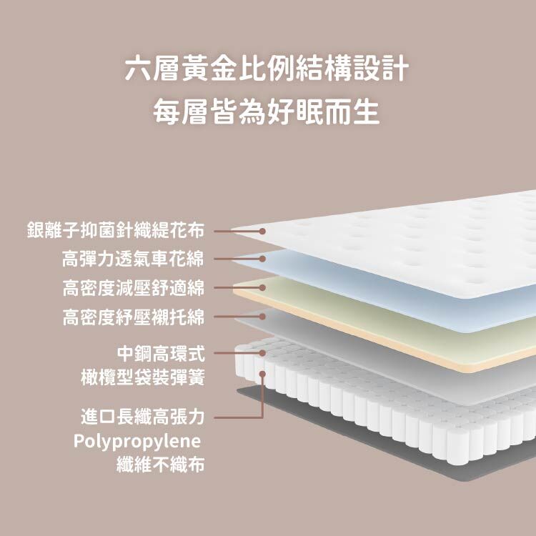 搭配6層黃金比例結構與獨家彈簧製程工法,每晚都睡得更安穩、舒適