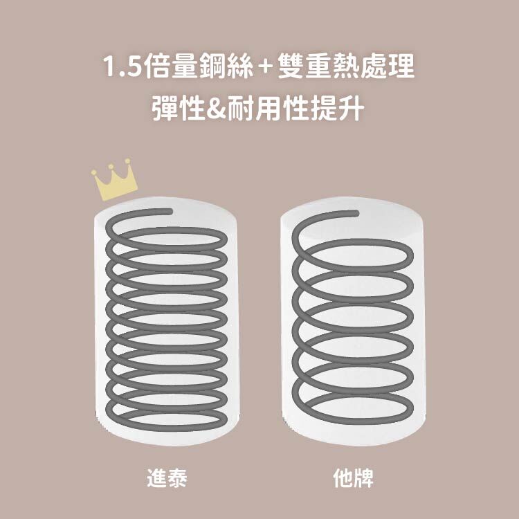 ◎獨特彈簧製程工法,絕佳支撐力與耐用性:特選鋼質穩定均勻的中鋼鋼材 - 高錳碳鋼絲,每顆彈簧皆用廠商獨家開模的彈簧模具,以1.5倍量(註)的鋼絲繞結成型,再經二次熱處理後壓縮入袋,增加彈簧彈性與耐用性也消弭彈簧疲乏性。(註:與一般泛用彈簧相比)