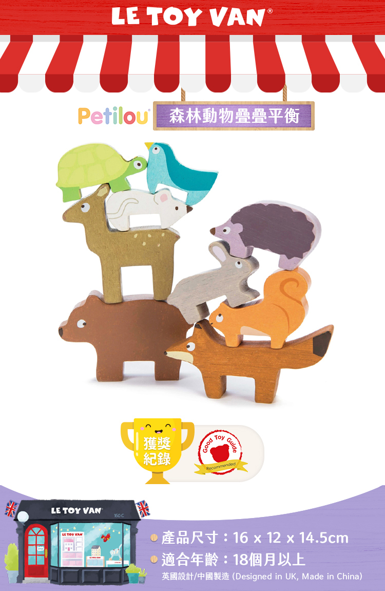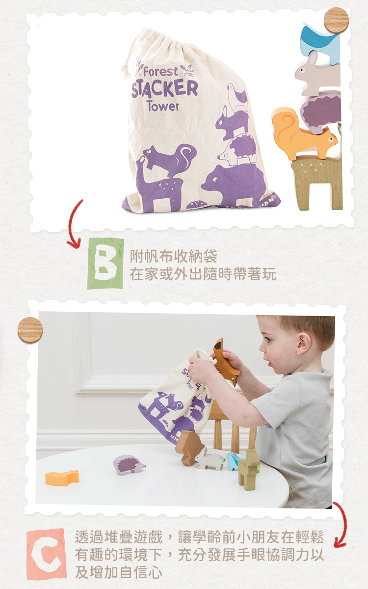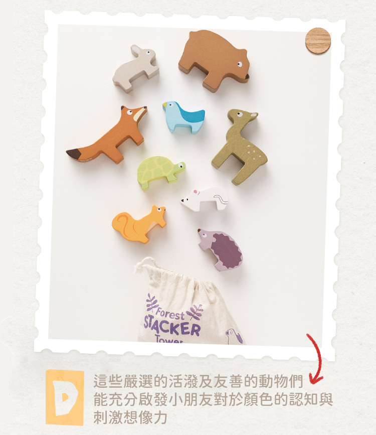 。這組森林動物動物疊疊樂,包含了小鳥、老鼠、烏龜、樹懶、狐狸、兔子、刺蝟、松鼠與花鹿