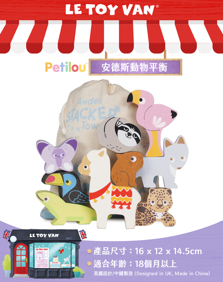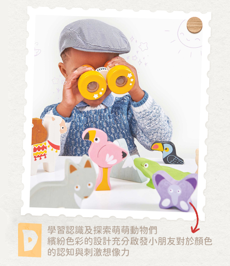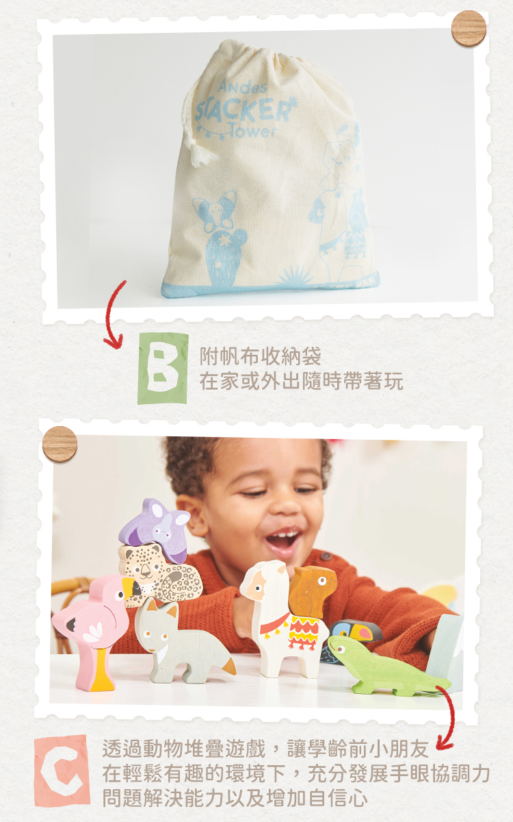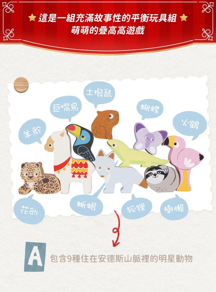 。這組安德斯動物疊疊樂,包含了羊駝、巨嘴鳥、土撥鼠、蝴蝶、火鶴、樹懶、狐狸、蜥蜴與花豹