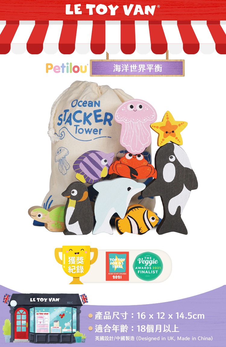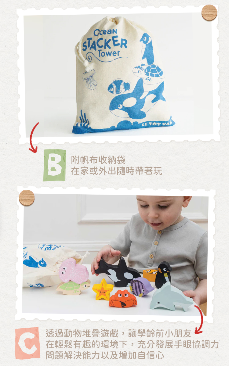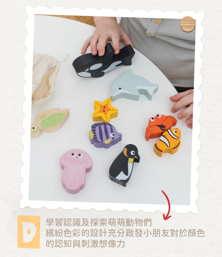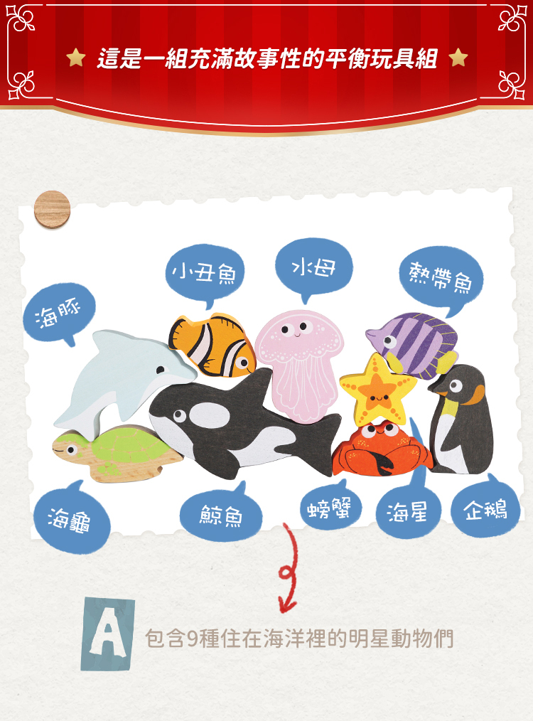 。包含9種住在海洋裡的明星動物們,鯨魚、海豚、海星、螃蟹、熱帶魚、小丑魚、水母、企鵝和海龜.