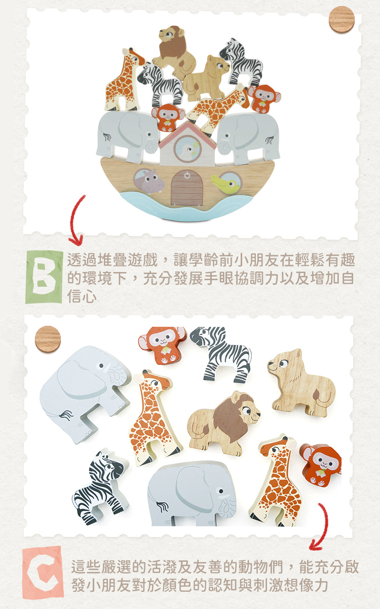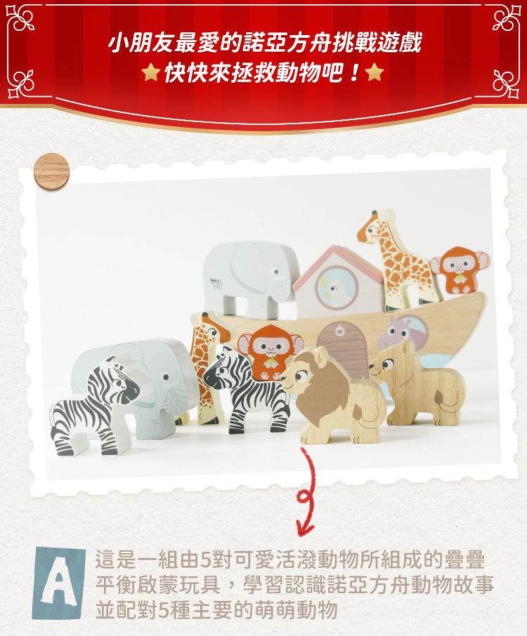 。小朋友最愛的諾亞方舟挑戰遊戲,這是一組由5對可愛活潑動物所組成的疊疊平衡啟蒙玩具