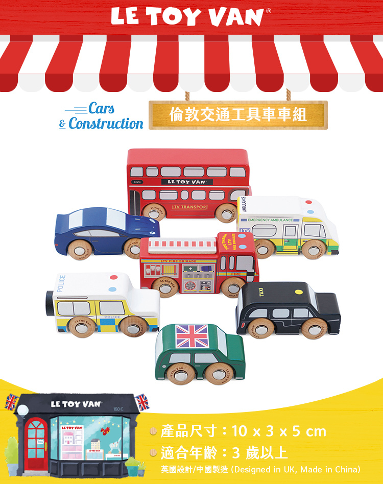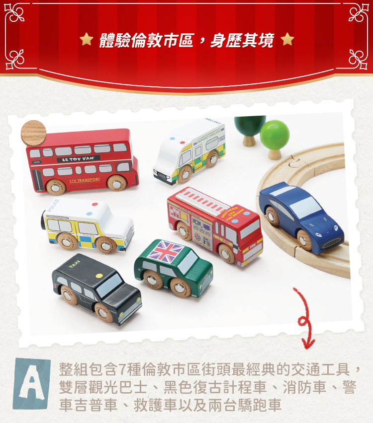 。整組包含7種倫敦市區街頭最經典的交通工具,雙層觀光巴士、黑色復古計程車、消防車、警車吉普車、救護車以及兩台驕跑車
