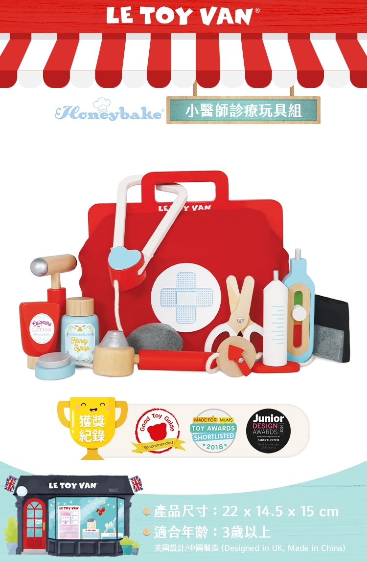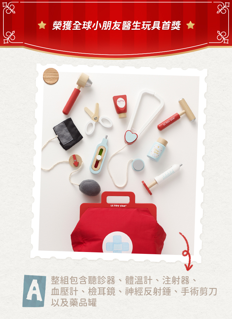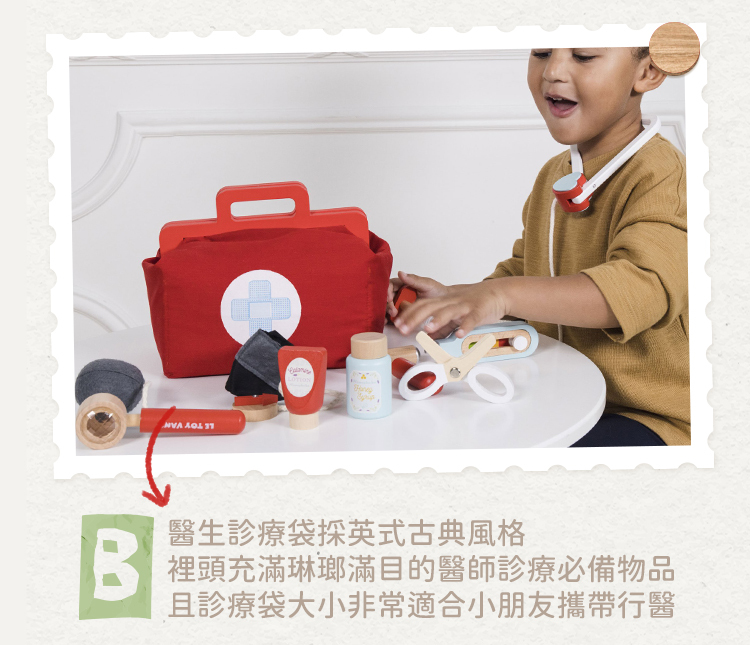 。醫生診療袋採英式古典風格,裡頭充滿琳瑯滿目的醫師診療必備物品,且診療袋大小非常適合小朋友攜帶行醫