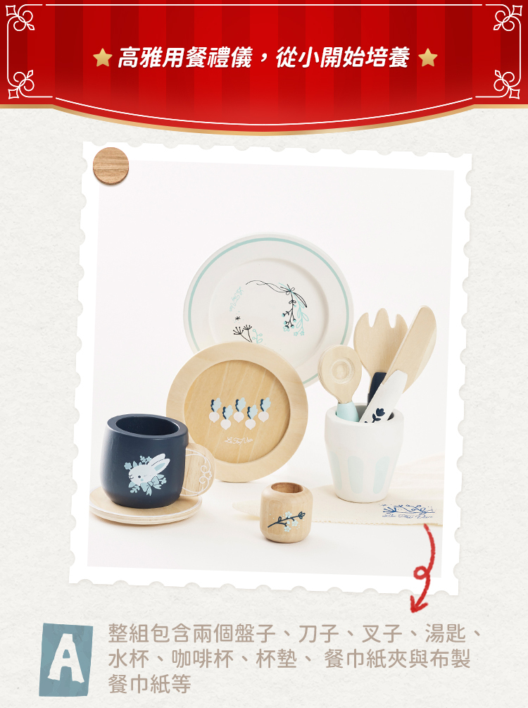 。整組包含兩個盤子、刀子、叉子、湯匙、水杯、咖啡杯、杯墊、 餐巾紙夾與布製餐巾紙等