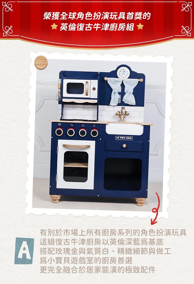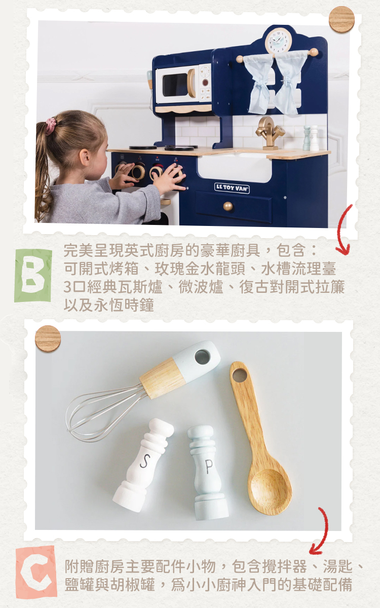 。有別於市場上所有廚房系列的角色扮演玩具,以英倫深藍為基底,搭配玫瑰金與氣質白,精緻細節與做工,可融合於居家裝潢的極致配件