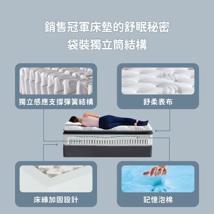 ◎袋裝獨立筒結構:採用獨立感應支撐彈簧結構,針對臀部與大腿部位強化承托力,每顆彈簧以高韌性鋼線製成,外層包覆透氣纖維布袋,彈性高、支撐佳,能精準回應身體各部位壓力,穩定撐起睡姿,不易干擾旁人翻身,提升整體舒適性與床墊耐用度,打造真正「會呼吸的好眠彈性系統」